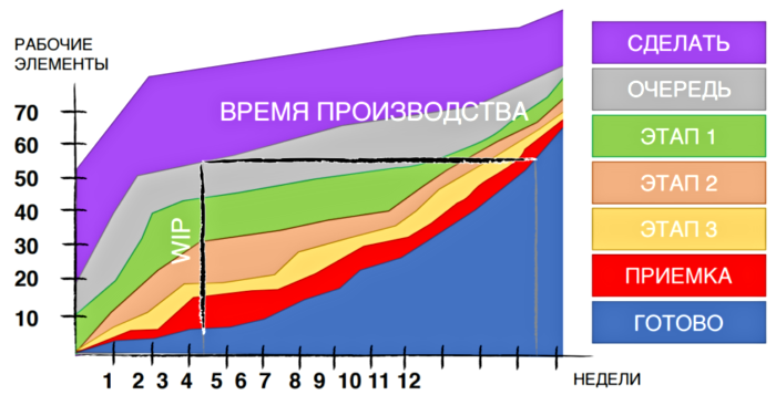 Данная диаграмма передает мониторинг количества рабочих компонентов на каждой стадии, проводимый изо дня в день. Ось Х отображает время, а ось Y – количество задач. Таким образом, можно наглядно заметить наличие узких мест в процессе разработки, если на графике возрастает какая либо область.